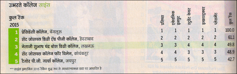 Tagore P.G. Girls College has been awarded Fifth position in the Top 5 list of the 'Best Emerging Private Colleges in Science Stream' of India by "India Today Magazine", in a survey conducted by " Nielsen " in the year 2015.
